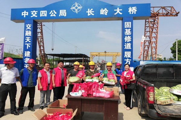 炎炎夏日挡不住志愿者心系一线建设者的急切关怀。8月2日,由安乡县交通运输局、bet365有手机版吗组成的职工志愿者服务队来到重点建设工程——安乡县长岭大桥看望坚守在高温下工作的一线路桥工人。志愿者分别为长岭大桥项目部83名路桥工人送上了价值近万元的西瓜、矿泉水、凉茶、金银花、花露水、霍香正气合剂、风油精等防温降暑物资组成的清凉大礼包。